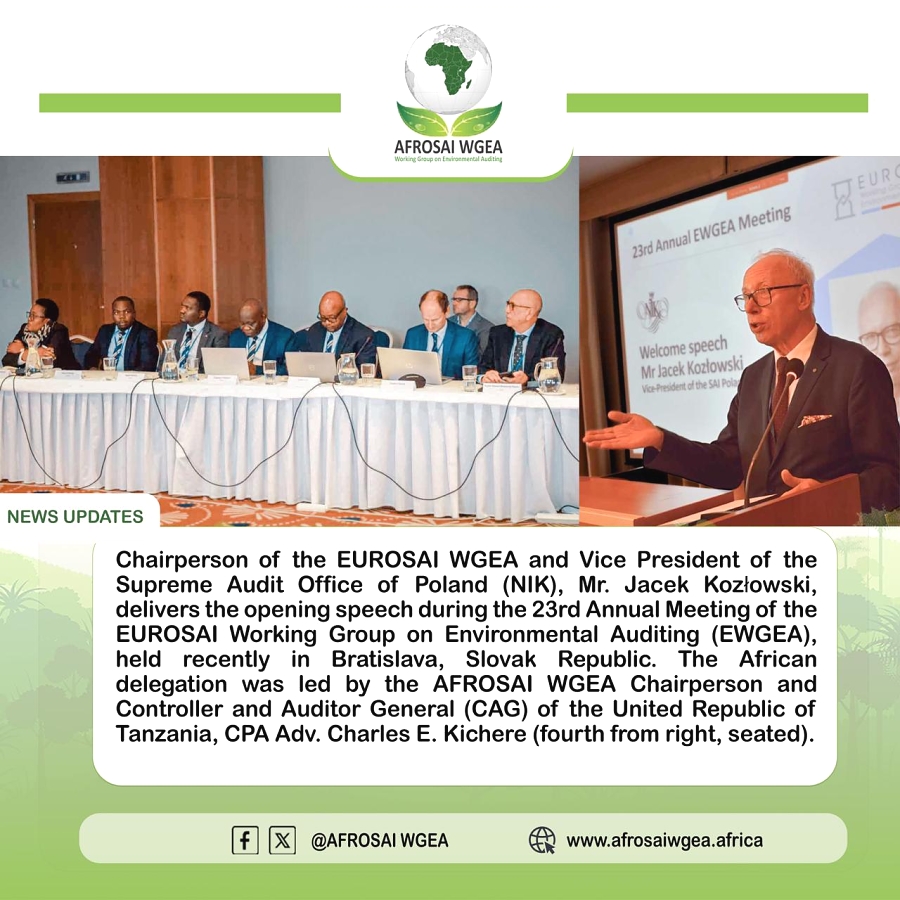 The African voice in environmental accountability resonated at the 23rd Annual Meeting of the EUROSAI Working Group on Environmental Auditing (EWGEA), held from 7–10 October 2025 in Bratislava, Slovak Republic. The AFROSAI WGEA delegation was led by the Chair, Mr. Charles E. Kichere, Controller and Auditor General (CAG) of the United Republic of Tanzania.